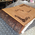Voilà j'ai reçu aujourd'hui notre livre d'or fait entièrement de bois, de papier vieillit le tout relié par un cordon de cuir. La couverture est gravée dans le bois. Il est encore plus beau en vrai et...