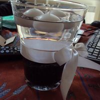 Salut les filles , je voulais faire ce qui est sur la photo pour mes centre de table mais avec un ruban rose et dès bougies rose . Par contre je ne sais pas quoi mettre dans le vase en plus de l'eau...