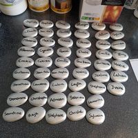 Hello. J'avance à grand pas. Marques-places fait cette après-midi. Ce sont des galets de couleurs argenté, et vous pouvez les trouver sur le site "Décorationdemariage.fr". Ils ne sont pas trop...