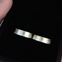 Cc après avoir commander nos bagues en décembre à une creatrice elle sont enfin là.... Pour monsieur en or blanc mat et moi en or blanc et rose marteler plus diamant la gravure (date de notre mariage)...