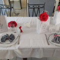Bonjour à toutes (et tous) hier j'ai fait une mise en place de mes tables avec déco, vous en pensez quoi? A noter qu'il manque bien sur la déco florale, j'aurais des petits vases boules avec une rose...
