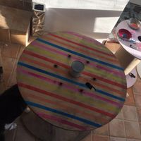 Après avoir recupere une grande bobine de chantier en bois, on a décidé d'en faire une table pour le coloriage pour le mariage, Pendant le vh les enfants auront un coin dédié du jardin avec animateur,...