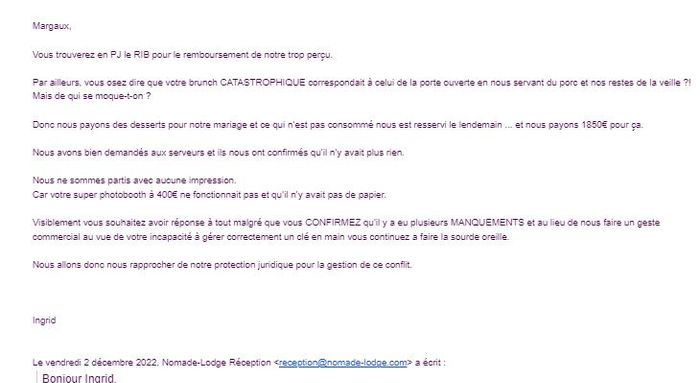 Bonjour les futures mariées, Je souhaite vous prévenir si vous souhaitez vous marier au nomade lodge! Les gestionnaires de ce lieu sont malhonnêtes et n'accèptent pas les feedeback qui ne vont pas dans leurs sens et les signalent Google avis, Zank...