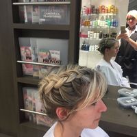 Voici premier essai coiffure. Avec des fleurs pour cacher la crotte derrière, en cachant la raie et avec 3 cm de plus vous en pensez quoi ?