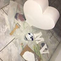 Voilà un coup de peinture blanc Des rose blanche Nos deux lettre peint en blanche Puis j’ai mis de la colle sur les lettres Ensuite j’ai mis sepoudré de paillette doré Je me mari dans 67 jours...
