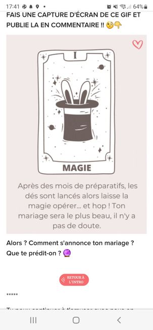 Coucou tout le monde 💜 Merci d'avoir participé jusqu'au bout ! Maintenant qu'on en sait un peu plus sur ton mariage, on va pouvoir tirer les cartes... FAIS UNE CAPTURE D'ÉCRAN DE CE GIF ET PUBLIE LA EN COMMENTAIRE !! 🧐👇 Alors ? Comment s'annonce ton...
