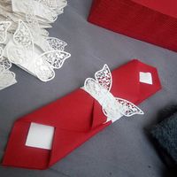 Voici nos boîte à dragées et Nos serviettes en papier sur le thème papillon... Couleur: Blanc, argenté et rouge