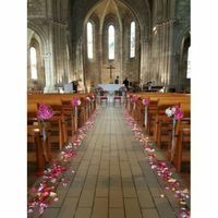Cc la commun alors voilà je suis en train de m occupé de la déco d église. J'aurai un tapis au sol de l allée, des pétales rose pâle et blanc,du tulle au banc avec noeud automatique et gros sucre d...