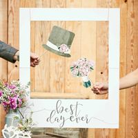 Photo booth avec micro pour nous laisser des messages et le contours de la photo aura le décors du faire part. Une arche de fleur en arrière plan ainsi que des "déguisements" à disposition pour les invités