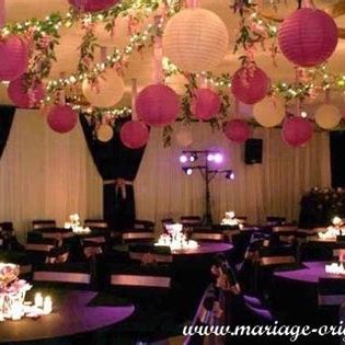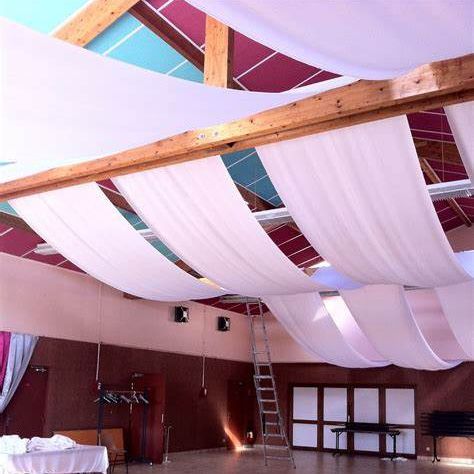 Coucou aucune decoration au plafond nous avons pas le droit la salle a été refaites récemment donc coup j'ai 2 ou 3 guirlandes just married en guise de décoration murale qui tiendra entre deux plaques sur les murs ! Et j'essaierai de faire des compositions florales assez haute pour donner du volumes sur les tables !