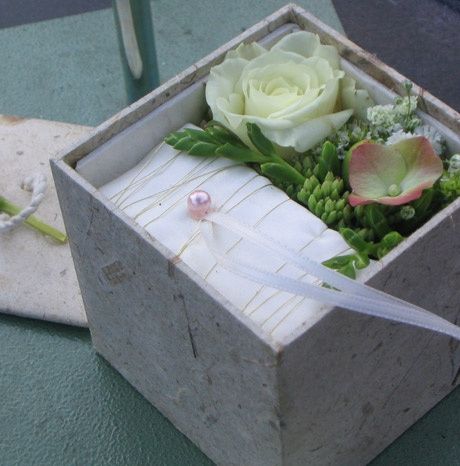 Moi je pensais a un cadre avec de la mousse, du liere... et que les alliances tiennent grace à deux fleurs