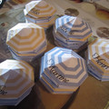 Salut les brides, voilà j'ai fini les 66 parasols marques places me manque plus qu'à les fixer aux transats dès que j'aurais trouvé un moyen de les stocker assemblés sans les casser! Parasols pliés...