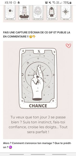 Coucou tout le monde 💜 Merci d'avoir participé jusqu'au bout ! Maintenant qu'on en sait un peu plus sur ton mariage, on va pouvoir tirer les cartes... FAIS UNE CAPTURE D'ÉCRAN DE CE GIF ET PUBLIE LA EN COMMENTAIRE !! 🧐👇 Alors ? Comment s'annonce ton...