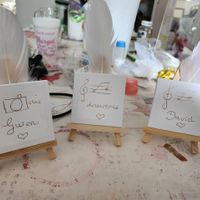 Coucou la commu ! Et me voici en pleine création. Ça fuse pour la finalisation et ça s'enchaîne! Voici les marques places des prestataires. Je vous laisse deviner qui est qui 😁 Et voilà !