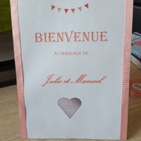 Bonsoir, Petite tentative du soir avec un panneau bienvenue au format A4. Il ira sur un chevalet de peintre devant la salle de réception. Qu'en pensez vous?