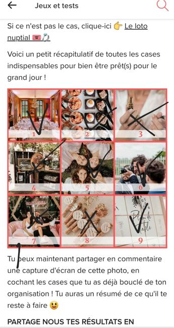 Si tu viens de tomber sur cette page c'est que tu as pu répondre à toutes les questions précédentes de notre loto nuptial ❤️ ! Si ce n'est pas le cas, clique-ici 👉 Le loto nuptial 🎟️💍 Voici un petit récapitulatif de toutes les cases indispensables...