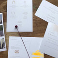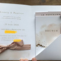 Hello! Ce soir j’avais envie de vous partager notre faire-part! Voici notre faire part, tout en dorure doré qui brille. Il y a une carte « programme », une carte Réponse sous forme de carte postal +...