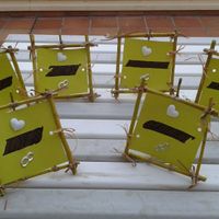 Des bambous, du rafia, des feuilles de papier a votre gout, de la colle,des ciseaux et de l'imagination Voila le resultat et je suis contente de moi en plus Noms de tables