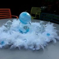 Bonjour les mariées (és) ! Que pensez-vous de mon centre de table ? Notre thème : angle bulle plume avec pour couleur bleu (notre couleur préférés) gris et blanc