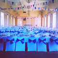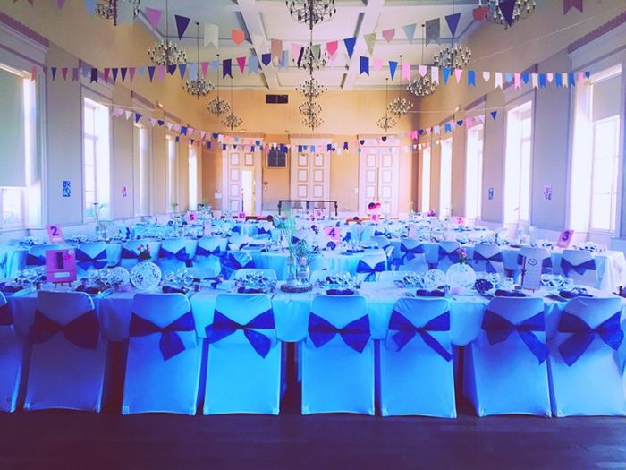Notre thème est champetre romantique rustique. Nos couleurs sont rose pâle, bleu marine et blanc avec de la toile de jute.