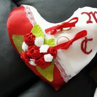 Coucou tout le monde ! En exclusivité pour vous les 1 ères photos de notre coussin d'alliances fait maison (avec nos alliances). Je n'ai pas fait une forme de coeur parfaite au dessus mais tant pis,...
