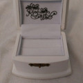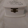 J'ai reçu ma boite à alliance . Mon homme avait flasher dessus et on adore l'idée de la boîte, on pense au côtés pratique avec notre fils qui nous l'amènera à l'église. A l'intérieur c'est marquer...