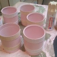 Voici mes boîtes de conserve décorées .plus qu'à attendre de nouvelles boîtes de conserve pour passer à la couleur beige avec petites dentelle rose et petites fleurs .moi j'adore. Grosse economie côté...
