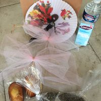 Voici les sacs invités que je suis en train de préparer A l’intérieur j’y mets : - 2 noeuds de voiture en tulle - une bouteille d’eau - 2 petites madeleines - un éventail - 2 sachets de lavandes - un...