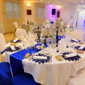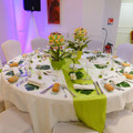 Voici un aperçu de notre salle de mariage sur le thème orchidée zen, couleurs bleu pour la table des mariés et vert anis pour les invités.