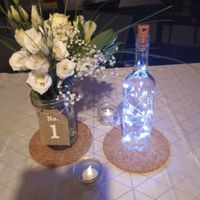 Coucou, Voici une ébauche de notre centre de table. On a vu la fleuriste, elle nous a fait un bouquet essai pour les centres de table (les fleurs seront bleues le jour J). On a mis des dessous de plat...