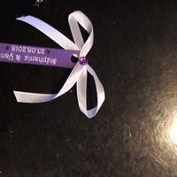 Hello la commu!! Ce soir c'est atelier noeuds!! Petits noeuds auxquels j'attache une étiquette de notre mariage. Je vais les coller sur des sachets en tulle blanc dans lesquels je mettrai mes cadeaux...