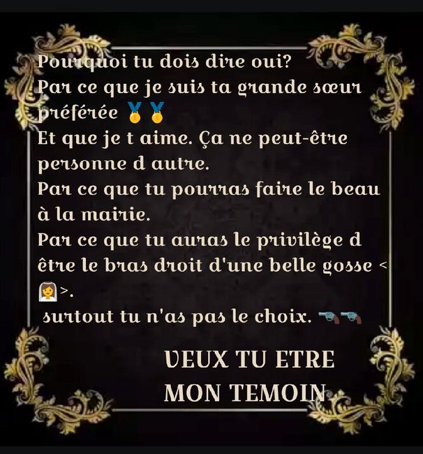 Bonjour les filles alors j ai posté dernier ma carte pour la demain de témoin à mon petit frère chérie. Et il a adoré. Mais malheureusement la carte j ai eu du mal à l imprimer il a eu la demande par MMS. Et un coffret de parfum. Aujourd'hui j ai...