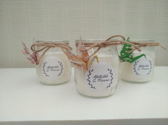 Et voilà, j'ai reçu nos étiquettes pour finaliser nos cadeaux pour les invités! Ce sont des bougies maison en cire de soja, dans les petits pots de yaourt en verre, il y aura moitié bougie/moitié petites plantes dans les mêmes petits pots décorés de...