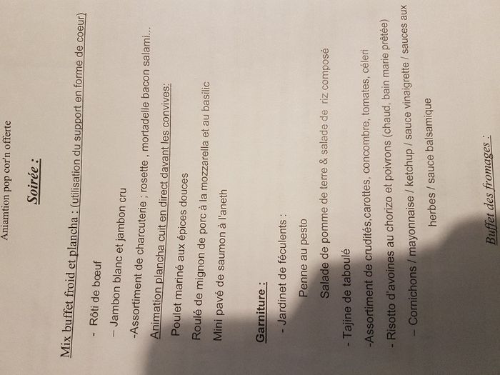 Bonsoir, voici ce que propose mon traiteur, je ne sais pas quoi acheter d’autre en nourriture ??? J’ai peur qu’il manque des choses C’est un buffet froid