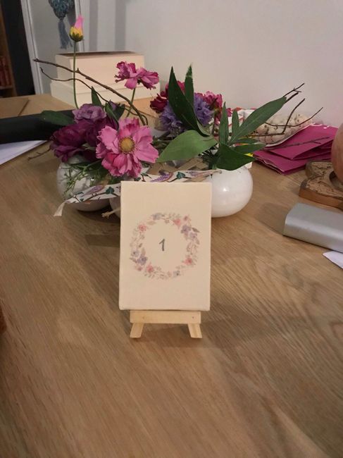 Salut tout le monde 😁 Premier essai pour les numeros de table ! J'ai mis le numero sur une petite toile sur un petit chevalet qui ira sur un rondin de bois en centre de table ! Je pensais mettre le numero un peu plus grand ! Vous en pensez quoi ?...