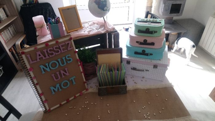 Re-coucou ! Aujourd'hui j'ai terminé notre livre d'or. Intérieur et extérieur. A côté il y aura la boîte avec des petites cartes pour els gens qui veulent écrire un mot sur place. Sur la couverture j'aimerai combler le petit vide du dessous mais vous...