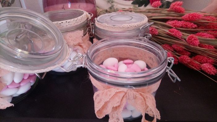 Salut ! Aujourd'hui j'ai reçu mes dragées. Il y en a des blanches aux amandes & des roses en forme de coeur, au chocolat. Mes pots sont des petits pots Le Parfait en verre, chinés à Emmaus, & décorés avec de la dentelle (rose pour les noeuds,...