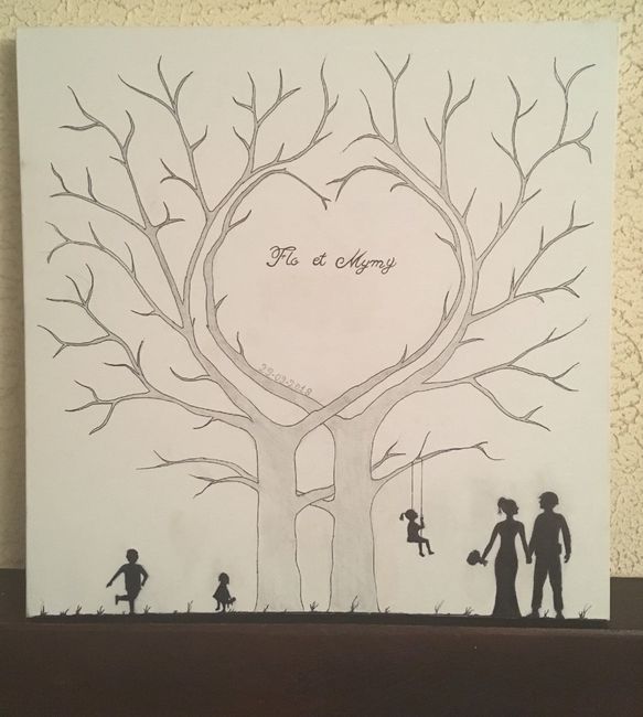 Bonsoir tout le monde! une petite chose de faite,notre arbre à empreintes fait par Mr... il c’est inspiré pour nos deux personnages de notre cake topper et à ajouté nos petits bambins d’amour😊
