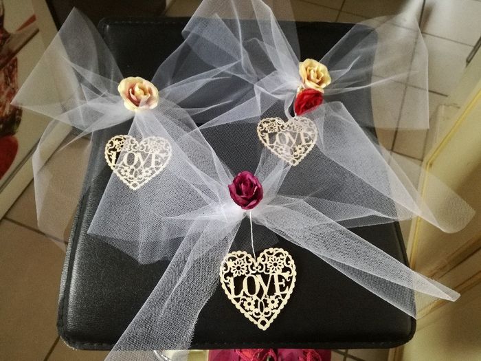 J-45, on continue d'avancer 50 pttes boîtes à dragées avec 1 p'tit cœur où sont gravé nos initiales et la date, pour fermer Et des noeuds fait par nos p'tites mains pour mettre dans les oliviers 😊 Belle journée 😘