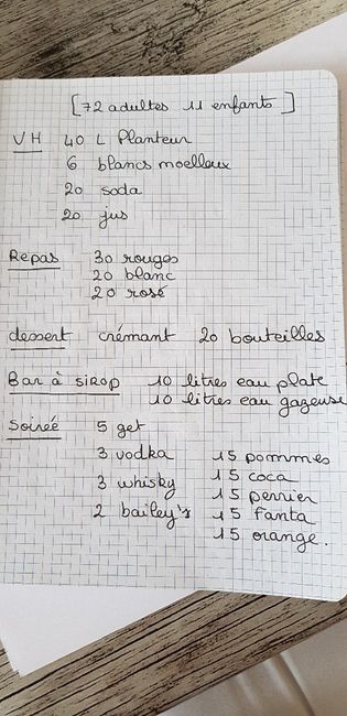 Bonjour la communauté, Je m’interroge comme beaucoup d’entre vous sur les quantités. J’ai 80 invités, je vais servir pendant le VH du punch et de la soupe de champagne et pendant le repas vin rouge, vin blanc et soft. Je suis perdue car en regardant...
