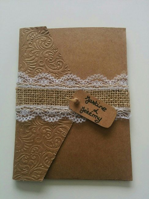 On continue les dit avec ce temps pluvieux. Voici nos faire parts complètement finis cette fois , j'ai modifié le devant j'ai écrit en blanc au lieu du noir et mis une corde tout autour. Chéri est ravis et j'avoue moi aussi un peu 😊