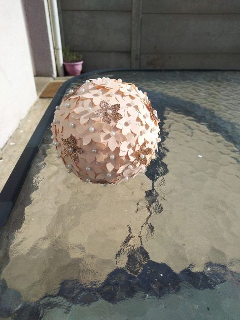Voici mes essais de pompons pour les voitures. Des idées ou photos pour décorer mon urne? Thème pêche, or et blanc.☺️
