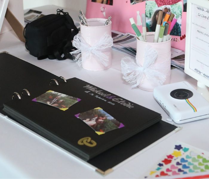 Bonjour, Avez vous mis une boîte pour le ou les stylos du livre d'or ? Si oui où l'avez vous trouvé et pouvez vous mettre des photos svp ? Sur ma table du livre d'or il y aura le livre d'or, stylo, globe terrestre qui est l'urne. Dois je rajouter...