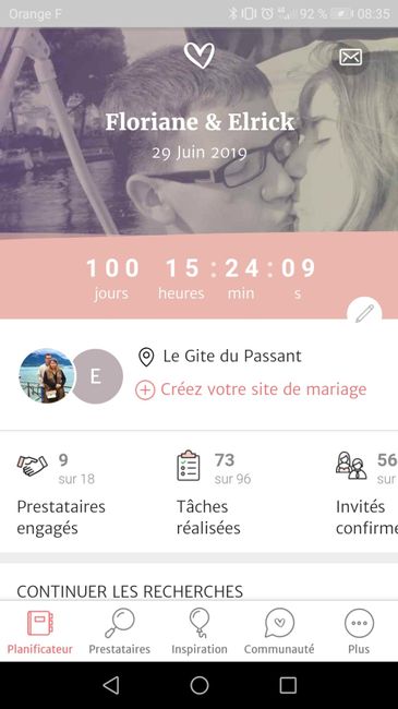 Trop excitée ça y est on va passer sous la barre des cents. On est plutôt bien avancés : - tous nos prestataires sont engagés - mes rdv essai maquillage et coiffure sont fixés - rdv essayages costume et robe après retouches fixé - rdv séance photo...