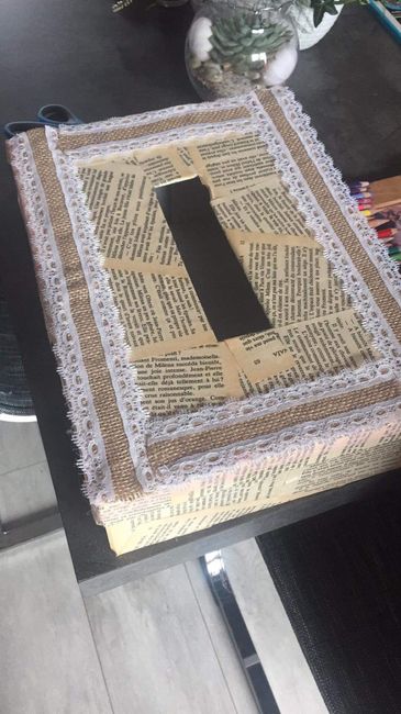 Urne pour le mariage faite ! Notre thème les livres 📚 je pense que j’aurai dû mettre les bandes de dentelles en biais mais bon c’est fait !