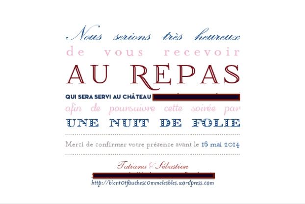 Bonjour a tous et a toutes, je me marie en juillet et ça y est nous avons imprimé nos menus, ça sera a base de fondant au chevre, tourte a la grenouille, trou ,magret de canard puis fromage et piece montée mais depuis le début ma mère est pénible...