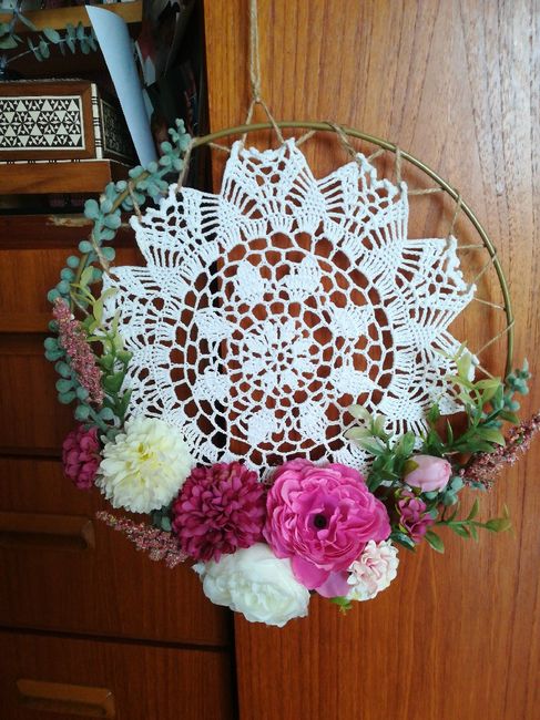 Bonjour a tous ! Petite création du jour, on le suspendera au dessus de nos places, il me reste a accrocher nos initiales en bois sur le napperon... A voir si j en fait un 2eme ou pas... J aime bien cet esprit champetre, boheme et un peu vieillot...