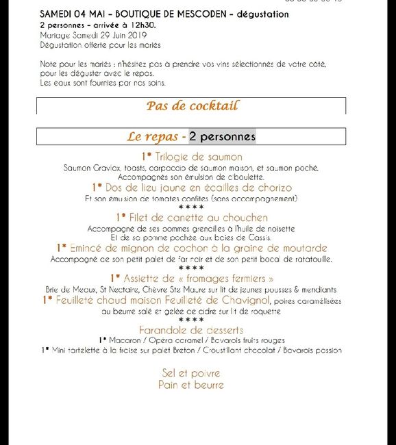 Bonjour ! Après la 2eme dégustation samedi réussie, j ai pu enfin faire mes menus ! Côte recto le repas, côté verso les boissons J en disposerais 2 par table ronde et 4 sur la table d honneur ovale. Et jai pu tester le plateau apero que je compte...