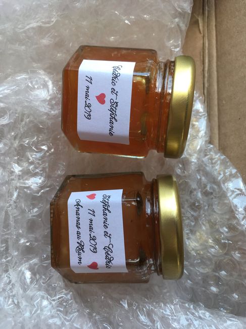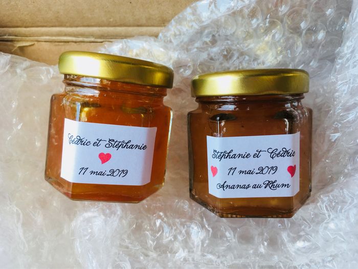 Trop contente j’ai reçu mes deux échantillons de confiture pour le cadeau des invités !!! Du coup entre les deux formules d’ecriture je ne sais pas laquelle choisir !!! Sachant que le nom de la confiture est noté en dessous du pot !!!