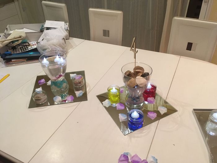 je fais des essais déco centre de table je voulais vos avis !! Soit vase eau + petit pot sable ou vase eau + petit pot eau (avec couleur différente ou même couleur ou sans couleur) Ou vase sable + petit pot sable ou vase sable + petit pot eau !!! 😅...